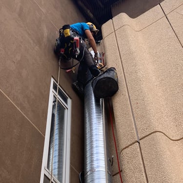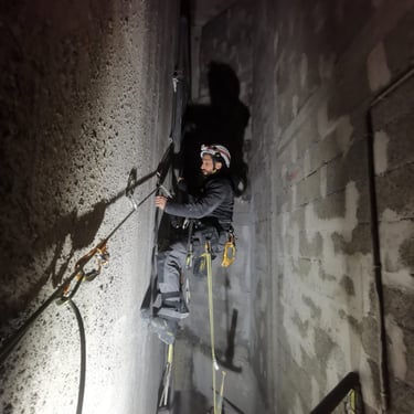 Nous réalisons tous types de travaux sur cordes, même dans les environnements les plus complexes : façades étroites, gaines techniques, cours intérieures, toitures difficiles d’accès, structures industrielles…